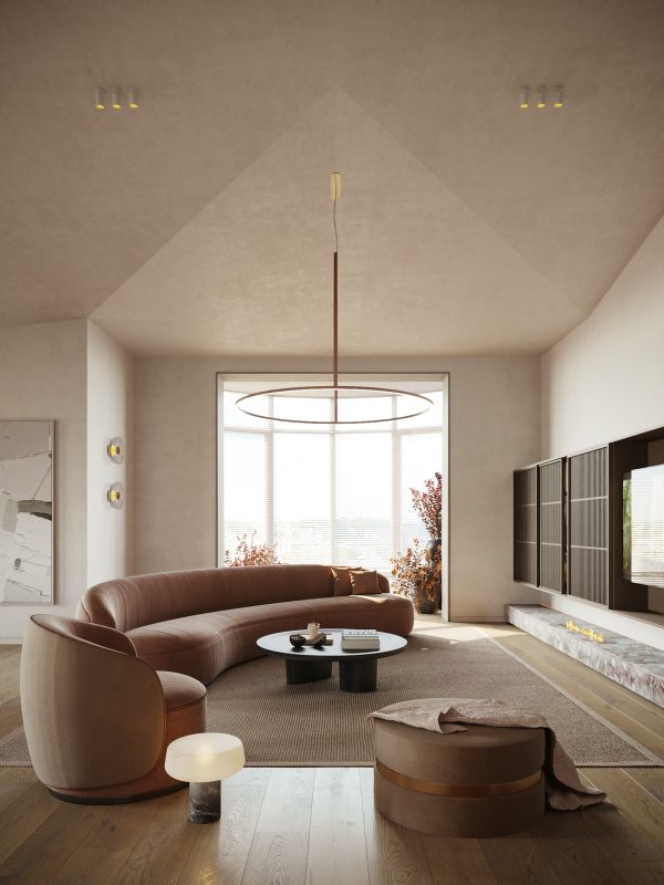 앞의 곡선 소파 하는 둥근 커피 표 느슨하게 가구 레이아웃 코어를 만든다. 원형 샹들리에가 곡선 모양 테마를 천장으로 가져옵니다.